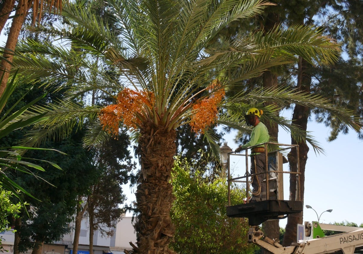 Este servicio incluye actuaciones como la poda de árboles y palmeras en todo el término municipal, el mantenimiento y resiembra de césped, entre otros