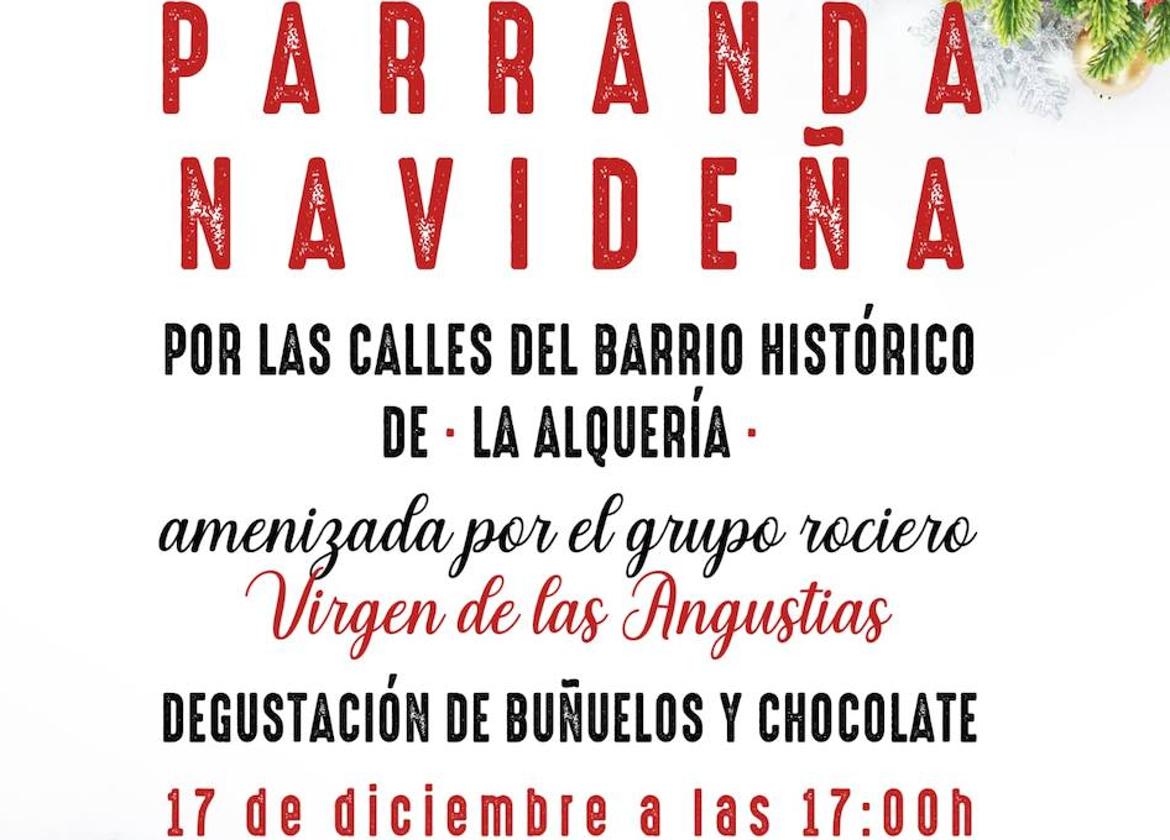 El punto de partida será el número 31 de la calle Barrio Alto, donde se ubica el Museo de La Alquería. La actividad estará amenizada por el grupo rociero Virgen de las Angustias. Para finalizar, se degustará chocolate con buñuelos. La cita está abierta a toda persona que se quiera sumar y celebrar, en familia o entre amigos, la Navidad. Desde la organización, se anima a vecinos y visitantes a disfrutarla.