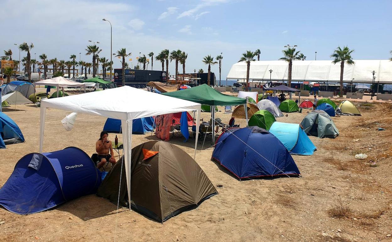 La organización da hoy la bienvenida a los primeros juerguistas con una fiesta abierta al público. Comienza a las seis de la tarde. Llegan desde distintos puntos de España y les sobran ganas de pasarlo bien. Algunos se hospedan en apartamentos, otros en caravanas y, un buen puñado, en tiendas de campaña. Los solares del Pago del Lugar, ubicados a escasos metros de las playas de El Censo y San Nicolás y del escenario principal de los conciertos, se han convertido en un campamento con aseos, duchas y otros servicios.