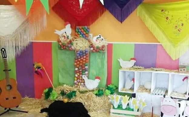 El centro ha elaborado un trabajo con material reciclado. Sus alumnos han pintado con paciencia los huevos que dan forma a la cruz y sus familias han aportado el resto del mobiliario como mantones, instrumentos musicales, elementos vegetales, etcétera. La escuela ha integrado la cruz de mayo en uno de sus programas educativos, que lleva por nombre La Granja.