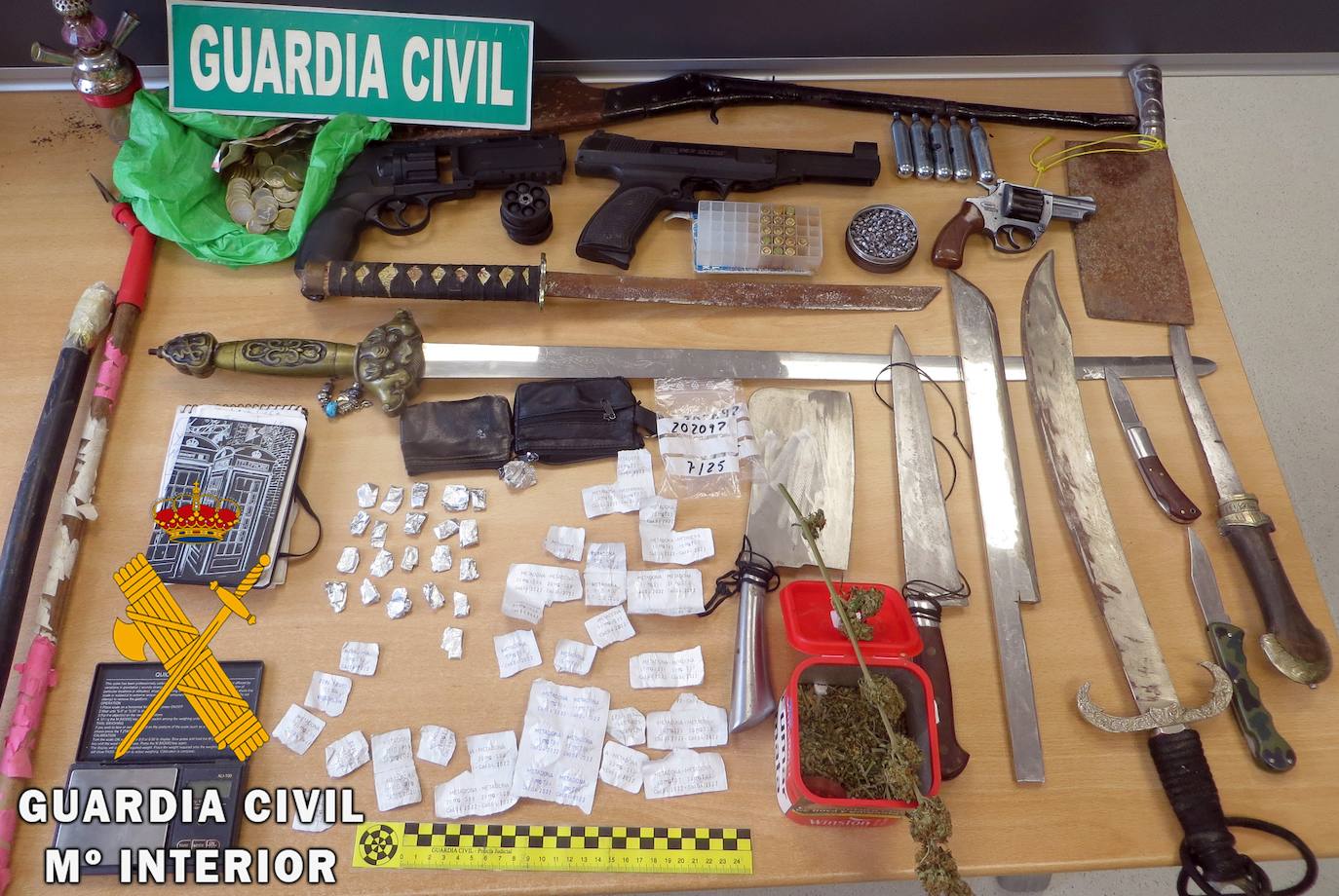 Los agentes, a través de la adquisición de información acerca de las organizaciones delictivas establecidas en la provincia de Almería y relacionadas con el tráfico de sustancias estupefacientes, tuvieron conocimiento de la existencia de un posible punto de venta de droga en Adra, órganizando un dispositivo de vigilancia que dio como resultado positivo. Los agentes realizaron la correspondiente inspección y registro, interviniendo 19 dosis de cocaína, 2 de heroína, 220g de marihuana, 50 pastillas de metadona, una báscula digital, 2 cuchillas de corte para droga, 1 escopeta manipulada, 1 revólver de gas, 1 pistola de balines, 1 revólver de petardos, 16 cartuchos de fogueo de 9mm y 10 espadas -katanas o similares-, además de 7.117 euros en efectivo.