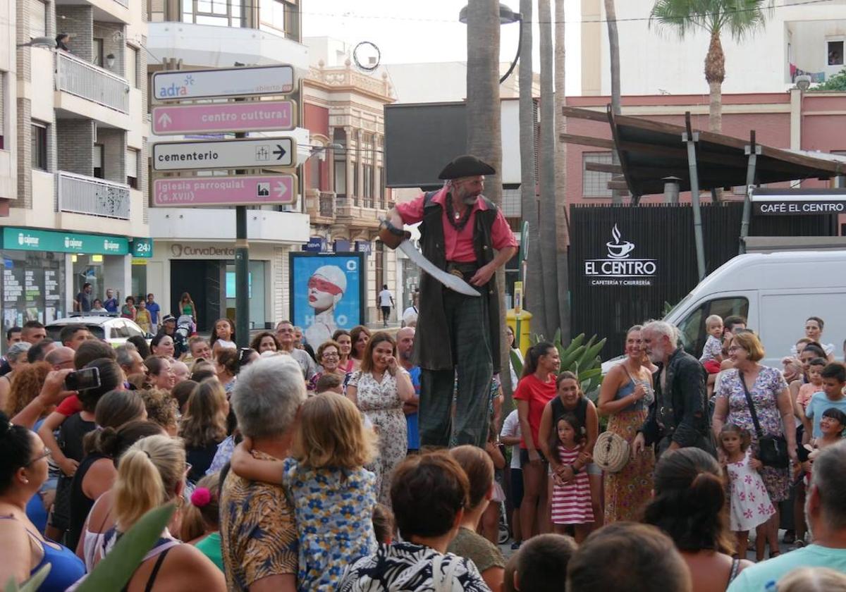 La Noche en Vela de Adra se vivió en familia. Niños y mayores se divirtieron con la representación teatral infantil de Vagalume Teatro, en la Plaza Puerta del Mar, a las ocho y media de la tarde. Fue el punto de partida de una programación que se sucedió casi de forma paralela en distintos enclaves de la localidad. En la ermita de San Sebastián, sonó el saxo de Sergio Martínez. En el Arco del Molino, el fuego fue protagonista de la mano de Tamarindo Malabar. El Circo Perla Calvaruso se instaló en la plaza Padre Alfonso Arcas y, en el Torreón de Olvera, se diseñaron pompas de jabón con Globusclown. Maral Eventos garantizó las risas y la diversión en el Centro de Interpretación de la Pesca a través de una plataforma 360. La música celta puso la guinda a la velada en la plaza Enrique Sierra Valenzuela, con The Celts Folk & Rock', y Dj Mario clausuró la Noche en Vela en el Muelle Gourmet.