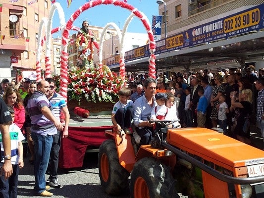 Tras la llegada de nuevo a la iglesia, fuera los más de cien caballos fueron pasando ante la mirada del santo, parado en la calle Real. Desde ahí fue llevado en sus andas hasta la Rambla de las cruces, donde le esperaba su tractor y acompañado de otras siete carrozas recorrió la calle, pasó por la vega, hasta la ermita de San Sebastián, acompañado por muchos vecinos, que sacaron su ropa más veraniega, muchas mujeres y niñas con sus trajes de gitana. También le siguieron las bestias: caballos y cientos de ovejas, que dieron más de un susto a los agentes de Policía Local, metiéndose por donde no debían. Los servicios de limpieza pasaban por cada rincón para tener las calles lo más limpias posibles. La romería ha terminado en la explanada del Molino del Lugar, con una gran traca. Y cientos de personas disfrutan de unas migas, arroz y vino en la explanada de la calle Mercado.