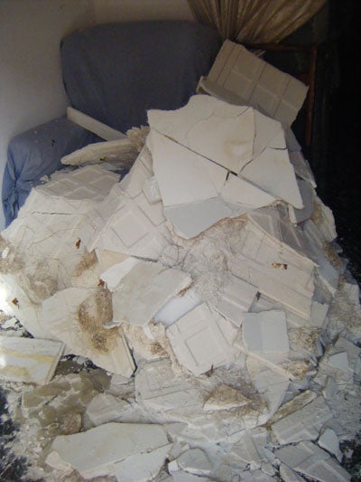 María del Carmen Martín dormía junto a su marido y también lo hacían sus hijos, de 15 y 7 años cuando sobre la una de ... la madrugada escucharon un fuerte estruendo y resultó ser la escayola del techo, que había cedido, provocando un gran estropicio.