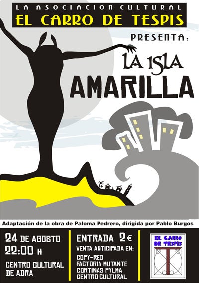 Segun nos informan desde el grupo, "la Asociación Cultural el Carro de Tespis tiene el placer de invitarte al estreno de su nuevo montaje 'La ... Isla Amarilla', famosa obra teatral de la dramaturga Paloma Pedrero, adaptada por los miembros de la compañía".