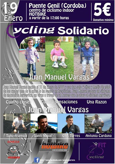 Será el 19 de enero desde las cinco de la tarde en Puente Genil (Córdoba): un 'cycling' solidario, clases de spinning con monitores llegados desde Madrid, Málaga, etc. Los donativos que se recauden se entregarán a la familia del niño abderitano, ya que se ha puesto un mínimo de cinco euros por participante. La actividad tendrá lugar en el Centro de ciclismo indoor Hotbike.
