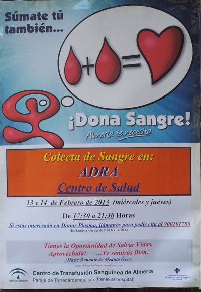 Los próximos miércoles y jueves 13 y 14 de febrero va a tener lugar en el Centro de Salud de Adra una recolecta de sangre y plasma.