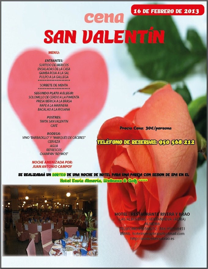 Hotel Restaurante Rivera y Brao (en Venta Nueva, Adra) ha organizado una velada muy especial para este san Valentín, donde las arejas que acudan, además de disfrutar de un delicioso menú y la música de Juan Antonio Campoy, podrán participar en el sorteo de una noche de hotel y Spa en La Envía.