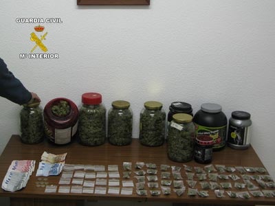 Como resultado de los registros, la Guardia Civil localizó, ocultos en distintos puntos de las viviendas, 10 tarros de diferentes tamaños repletos de marihuana, además de 52 dosis de idéntica sustancia dispuestas para su venta y más de 450 ?, fraccionados en billetes y monedas, procediendo a continuación a la detención de A. J. F. G., de 25 años, F. J. C. H., de 24, J. A. C. H., de 28, J. C. S., de 56, M. H. B., de 52 y N. F. G., de 39, todos vecinos de Adra (Almería), como presuntos autores de los delitos contra la salud pública.