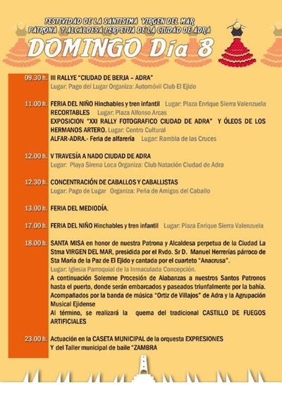 Hoy domingo es el día de la virgen, además nombrada alcaldesa perpetua de la ciudad, y a las 18:00 será la misa y después ... la procesión. Se están ultimando los detalles para ver si las imágenes pueden ser embarcadas, ya que debido a las leyes marítimas no es seguro que se pueda hacer.