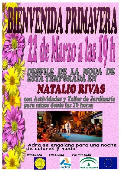 Este fin de semana en Adra tiene como claro protagonista la primavera. La Asociación de Comerciantes, Empresarios y CCA de Adra, en colaboración con el Ayuntamiento de Adra, han organizado la actividad 'Bienvenida Primavera' que centrará buena parte de las actividades de este fin de semana, enmarcadas dentro de la programación cultural del Ayuntamiento de Adra, 'Adra un Mar de Culturas".