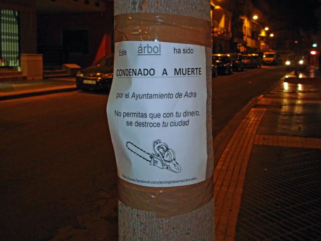 Ecologistas en Acción ha manifestado su malestar por la sustitución de los árboles de la calle Natalio Rivas de Adra por jardineras y lo ha hecho pegando carteles de denuncia donde se podía leer 'este árbol ha sido condenado a muerte'. El colectivo culpa de su desaparición al Ayuntamiento que, por su parte, alega haberse visto obligado a eliminar el arbolado de la calle principal del municipio por las averías, destrozos y caídas que estaban ocasionando sus raíces. 'No permitas que con tu dinero se destroce tu ciudad', reza el cartel.