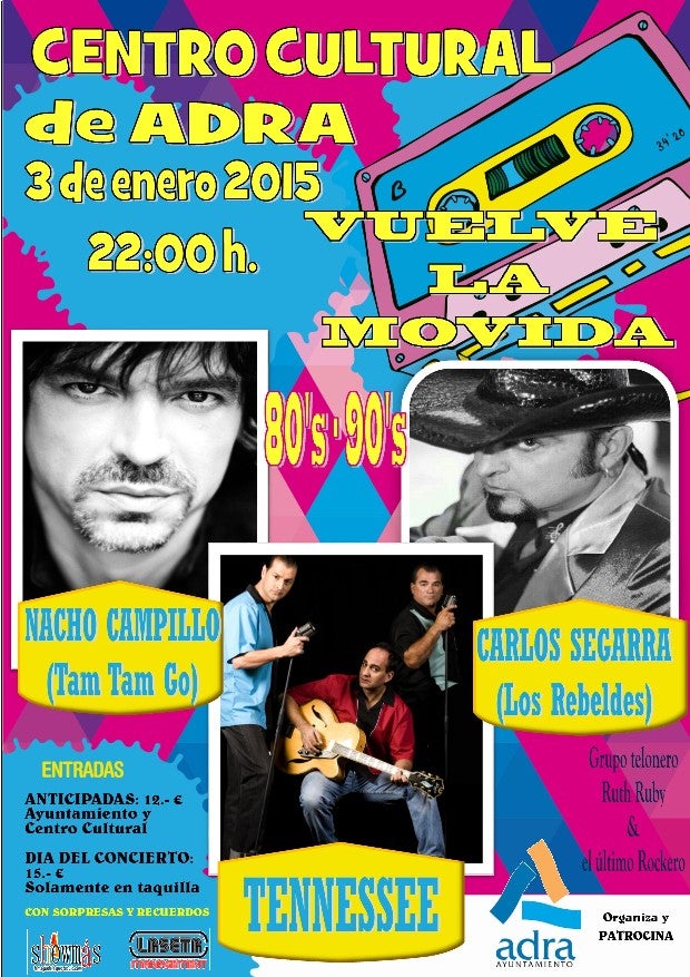 Lo mejor del pop español de los años 80 llega a Adra y en versión original. El Centro Cultural acoge el 3 de enero un espectáculo que concentra en un mismo escenario a tres grupos emblemáticos de nuestro país: Tennesse, Tam Tam Go y Los Rebeledes. Las entradas ya están a la venta. El concierto, que dará comienzo a las diez de la noche, lleva por nombre Caravan Pop y forma parte de la programación cultural confeccionada por el Ayuntamiento de Adra para esta Navidad. Las entradas se pueden adquirir en la taquilla del Centro Cultural de Adra y en el Ayuntamiento. Su precio anticipado es de 12 euros y de 15, si se adquieren el mismo día de la actuación.