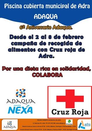 La Piscina Municipal Cubierta de Adra ha iniciado una campaña de recogida de alimentos entre sus usuarios. Entre el 2 y el 8 de febrero, las instalaciones que gestiona la empresa Adaqua se brindan a ayudar a quienes más lo necesitan. Todo lo recaudado se entregará a la asamblea local de Cruz Roja. El lema elegido para incentivar la participación es 'Por una dieta rica en solidaridad, colabora'. La iniciativa coincide con el sexto aniversario de la Piscina Cubierta.