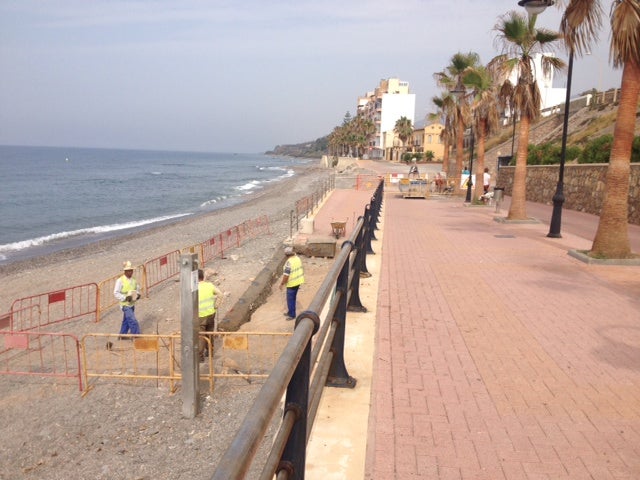 El paseo marítimo de Poniente recupera poco a poco su aspecto original. Después de regenerar la arena y corregir los daños del temporal de viento que azotó al litoral abderitano el pasado mes de febrero, la Jefatura Provincial de Costas repara los desperfectos generados por el mar en el propio paseo. En la imagen, los operarios trabajan en la reconstrucción de una rampa de acceso cercana a barriada de La Caracola y en la reparación de las duchas. Los trabajos coinciden con el inicio de la temporada de baño que en Adra comenzó el 15 de junio.