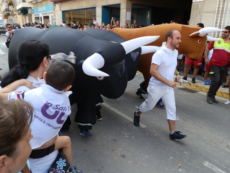 Camiseta blanca, pañuelo al cuello y periódico en mano. Es el particular 'uniforme' que ayer vistieron cientos de niños en Adra para participar en el tradicional encierro en honor a su patrón. Raudos y veloces, recorrieron la calle Natalio Rivas perseguidos por seis toros bravos y juguetones. El de San Nicolás no es un encierro cualquiera, es la forma más divertida de despedir unas fiestas que llegan mañana a su fin. Un año más, y van diez, la plaza Puerta del Mar fue testigo del habitual 'chupinazo' que anunciaba el inicio del encierro. Los toros aguardaron con paciencia el momento de su salida en la Casa Consistorial mientras la expectación de los más pequeños iba en aumento. Acompañados por padres, tíos y abuelos, corrieron, saltaron y cantaron al ritmo de la música hasta desembocar en el Museo del Mar, convertido en una improvisada plaza de toros. Al unísono, pidieron la 'bendición' a su patrón en su día grande y entonaron el 'pobre de mí'.