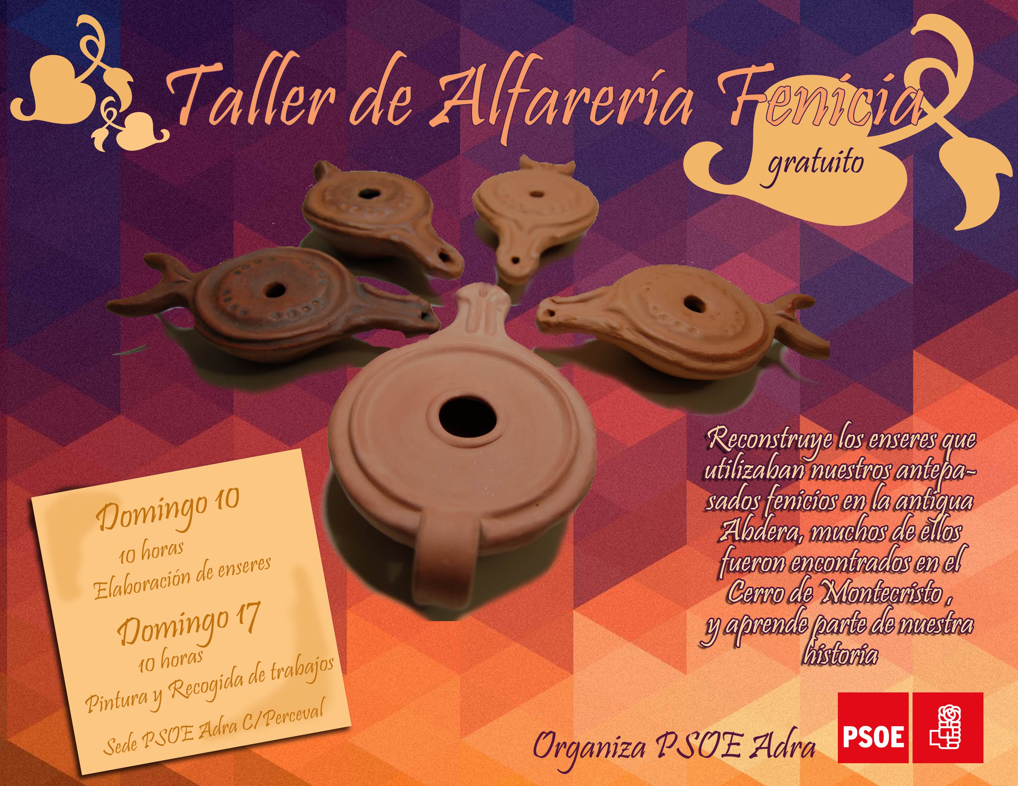 El PSOE de Adra ha organizado un taller de alfarería fenicia. Dar a conocer a los más pequeños los hallazgos históricos de la época, enseñándoles a reconstruir diferentes enseres hallados en el Cerro Montecristo, es el objetivo de esta iniciativa que evoca los orígenes de la antigua Abdera. La cita tendrá lugar en la sede socialista, en la calle Perceval de Adra, durante el 10 y el 17 de abril. «La mejor forma de que los más pequeños valoren la riqueza cultural e histórica de nuestro municipio es haciéndoles partícipes mediante talleres como este, en el que con sus propias manos pueden recrear artilugios que los fenicios que habitaban nuestra ciudad utilizaban en su vida cotidiana», ha explicado el secretario de Cultura de la ejecutiva local, Jose Antonio González. El taller está destinado a niños de todas las edades y es gratuito. El partido se hace cargo de habilitar el espacio, aportar los materiales necesarios así como las herramientas necesarias para desarrollar la actividad.