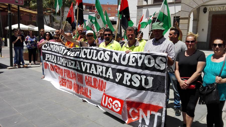 La protesta ha tenido lugar a las puertas del Consistorio, apenas un día después de que ardiera una barredora en el paseo marítimo de la localidad por motivos desconocidos. Convocada por los sindicatos CNT y USO, la concentración sirvió para hacer ruido acerca de un problema que se viene denunciando desde hace tiempo. «Con una recaudación anual de 2.070.000 euros en concepto de tasas por recogida de basura, es inadmisible que el PP que gobierna el Consistorio, no contemple en la elaboración de los presupuestos municipales para 2016 la compra de nuevos vehículos que garanticen un servicio de limpieza viaria público, óptimo, y de calidad», argumentan los sindicalistas, que también reprochan a la oposición no reivindicar con «más énfasis» sus demandas.