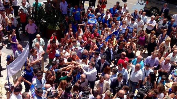 A más de 30 grados a la sombra, los abderitanos han aguardado pacientemente en la plaza Puerta del Mar la llegada de Rajoy, que se ha hecho esperar. Un grupo de afiliados al partido le agradecía en una pancarta la materialización de la A7, la rebaja fiscal para los agricultores y los espigones para defender la costa. La visita del presidente apenas ha durado 45 minutos. Ha tenido tiempo para saludar a los vecinos, fotografiarse con los simpatizantes e, incluso, pedir su voto a las puertas del Consistorio. Rajoy ha apelado "al mayor partido de España, el que tiene más militantes, al más grande, al que ha tenido más votos en las últimas elecciones y al que va a ganar las elecciones".