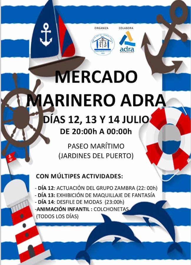 El Ayuntamiento de Adra, por su parte, colabora en la organización de este mercado marinero que está incluido en la programación de ocio y cultura orquestada por el Consistorio para los meses de verano. El mercado marinero se inaugurará el día 12, a partir de las ocho de la tarde. Para la ocasión se han concretado actividades paralelas como la actuación de la escuela municipal de baile, Zambra, que actuará ese mismo día a partir de las diez de la noche. El miércoles se realizará una exhibición de maquillaje de fantasía y el jueves, desfile de modas. Arrancará a las once de la noche. Además, durante los tres días de duración de este mercado marinero, habrá actividades de animación infantil y colchonetas.