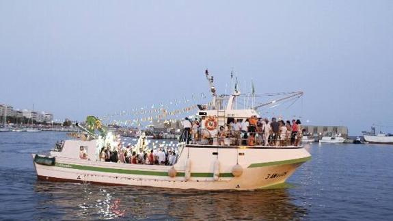 La imagen sale en procesión y, como es tracidional, embarca en uno de los barcos que conforman la flota abderitana