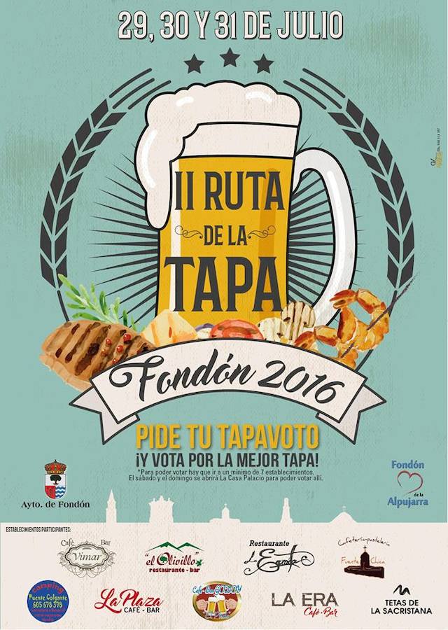 La cita más inmediata tendrá lugar entre el 29 y el 31 de julio. Por segundo año consecutivo, el Ayuntamiento apuesta por la Ruta de la Tapa para presumir de platos tradicionales que se complementan con una chispa de innovación. Más de una decena de bares y restaurantes mostrarán a vecinos y visitantes lo mejor de la gastronomía fondonera. Todos los establecimientos hosteleros de la localidad, sin excepción, se han volcado en esta segunda edición lo que garantiza de antemano su éxito. Esta participación es, además, un indicativo de los buenos resultados que arrojó la primera edición en un pueblo, Fondón, que apenas roza el millar de habitantes.