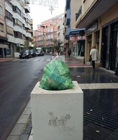 Así amanecía esta semana una de las papeleras que bordean la calle principal de Adra, Natalio Rivas.