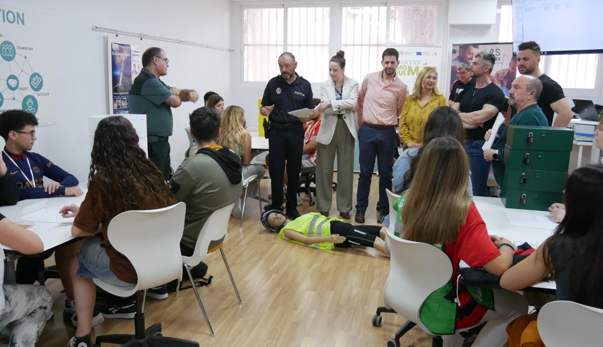 Alumnos de Bachillerato de los institutos Abdera y Gaviota han participado en esta iniciativa enmarcada en el programa Agente Tutor. Los ediles de Seguridad Ciudadana y Servicios Sociales, José Crespo y Patricia Berenguel, visitaron una de estas sesiones, acompañados de la directora y el jefe de estudios del IES Abdera, Lola Arróniz y Juan García, y del coordinador de la DGT, Juan Segovia. Los jóvenes asumen el rol de un bomberos, Guardia Civil, personal sanitario o personal civil mientras se afanan en encontrar las claves hasta hallar la solución final.
