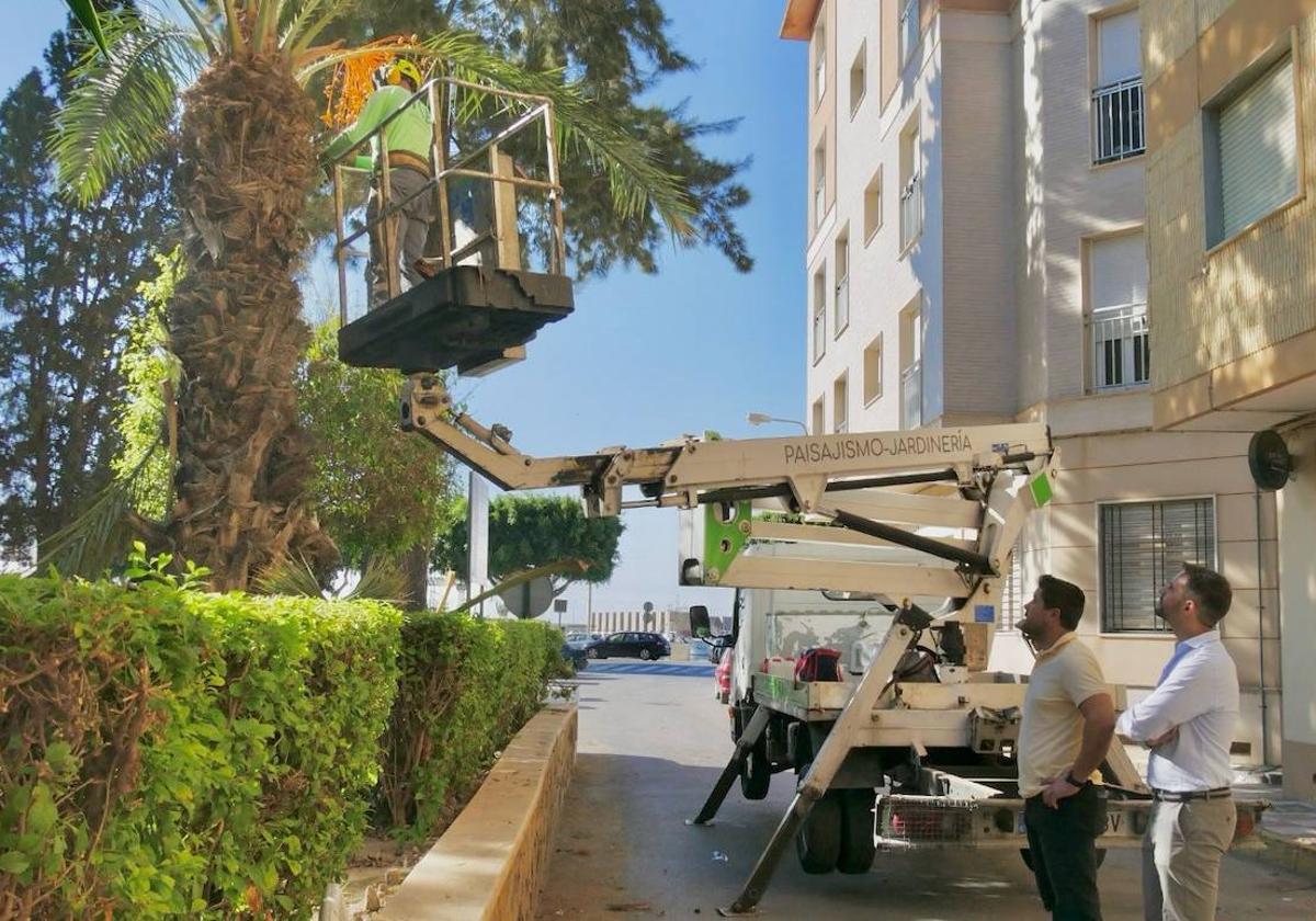Para comprobar de primera mano el desarrollo y buen resultado de este plan de mantenimiento, el concejal de Parques y Jardines, Antonio Sánchez, acompañado del portavoz del equipo de Gobierno, José Crespo, se ha desplazado hasta los Jardines de Heredia donde se está procediendo al recorte de palmeras. «Es uno de los lugares más emblemáticos de la ciudad y su cuidado y mantenimiento es importante para que los abderitanos y abderitanas puedan disfrutar de esta y otras zonas verdes tan características en la localidad», ha subrayado Sánchez. Asimismo, ha asegurado que «desde el Consistorio hemos invertido una cantidad cercana a los 190.000 euros en el área de Parques y Jardines para avanzar en los servicios básicos de calidad que priman en este equipo de Gobierno».