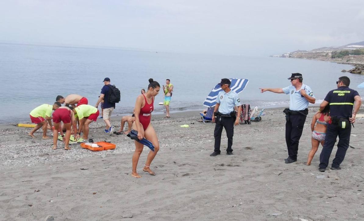 Adra ha puesto a prueba el servicio de salvamento en sus playas con un simulacro realizado en la playa Sirena Loca. Con una respuesta «rápida ... y efectiva», el dispositivo se centró en un bañista en apuros que pudo ser rescatado gracias a la coordinación de Protección Civil y Policía Local.