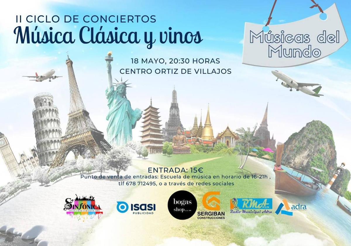 La escuela de música Sinfónica continúa su ciclo de conciertos Música Clásica y Vinos. En esta segunda edición, se ha incluido un concierto sobre músicas ... del mundo. Será el 18 de mayo, a partir de las ocho y media de la tarde, en el Centro Ortiz de Villajos.