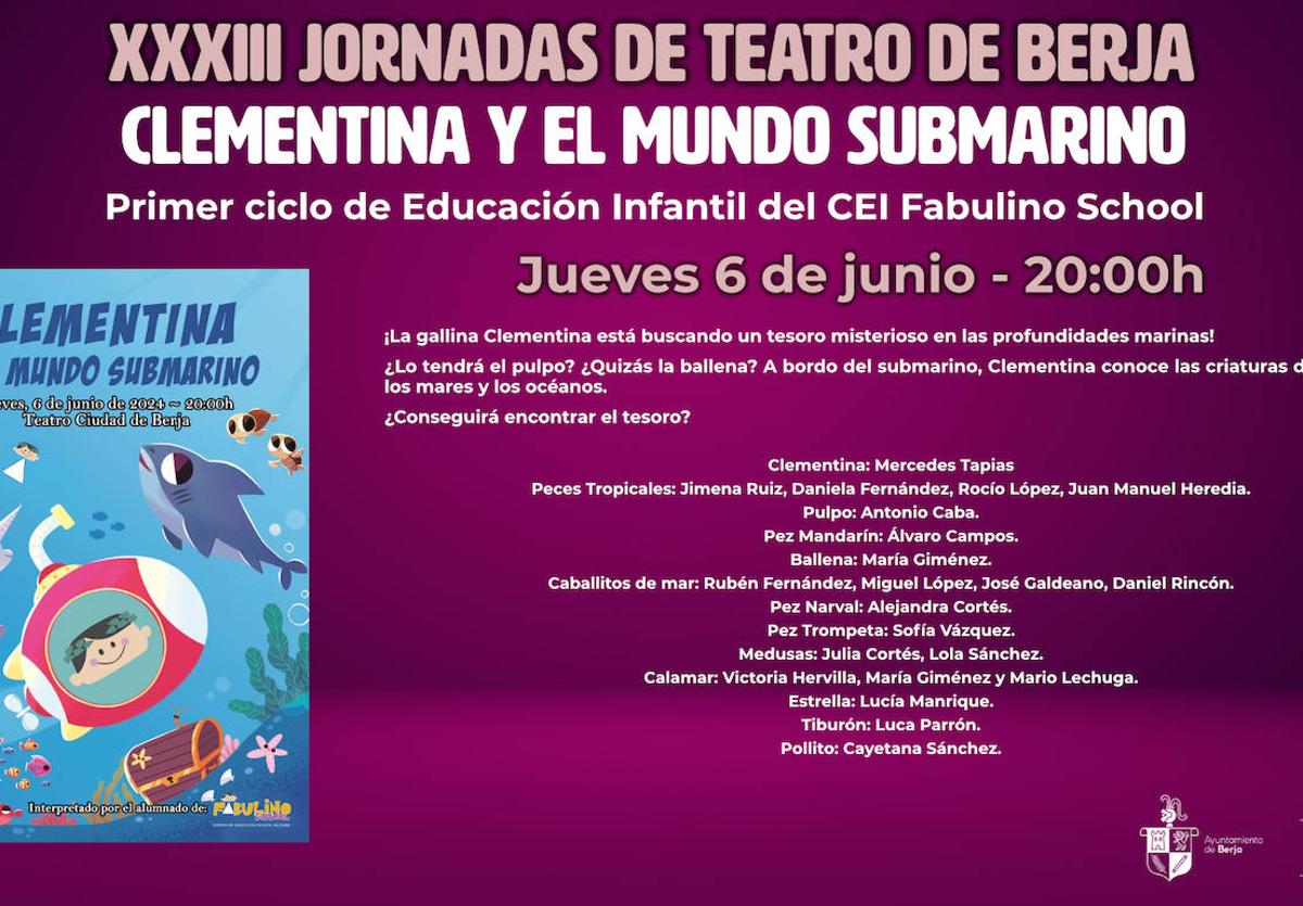Los alumnos del primer ciclo de Educación Infantil del CEI Fabulino School toman mañana el relevo en las Jornadas de Teatro de Berja, que celebran ... su edición número 33. Los pequeños interpretarán la obra 'Clementina y el mundo submarino'. Será en el Auditorio Ciudad de Berja Miguel Salmerón, a partir de las ocho de la tarde. La entrada es gratuita hasta completar aforo.