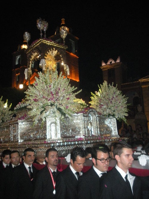 44 horquilleros, vestidos de traje y camisa blanca, portaron a hombros el nuevo trono, realizado en Granada en metal plateado por el orfebre Manuel Martín Álvarez, quien no quiso perderse el estreno y acudió a la misa, que estuvo presidida por el obispo de Almería, Adolfo González Montes, con asistencia de autoridades civiles locales y provinciales, hermandades y cofradías de la zona.