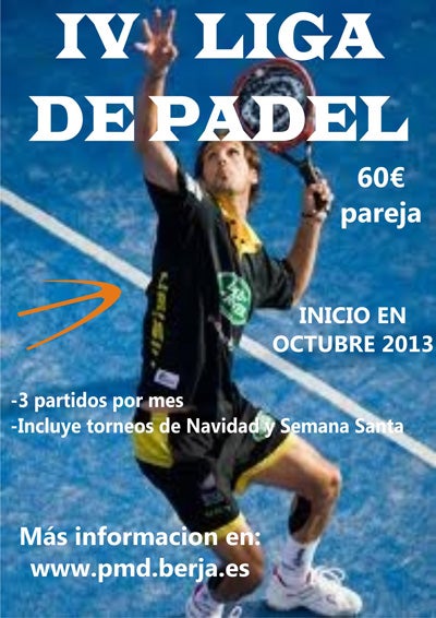 La liga de pádel, en su cuarta edición, tiene previsto su inicio en este mes de octubre. Los equipos estarán compuestos por un máximo de ... tres personas pudiendo ser masculinos, femeninos ó mixtos.
