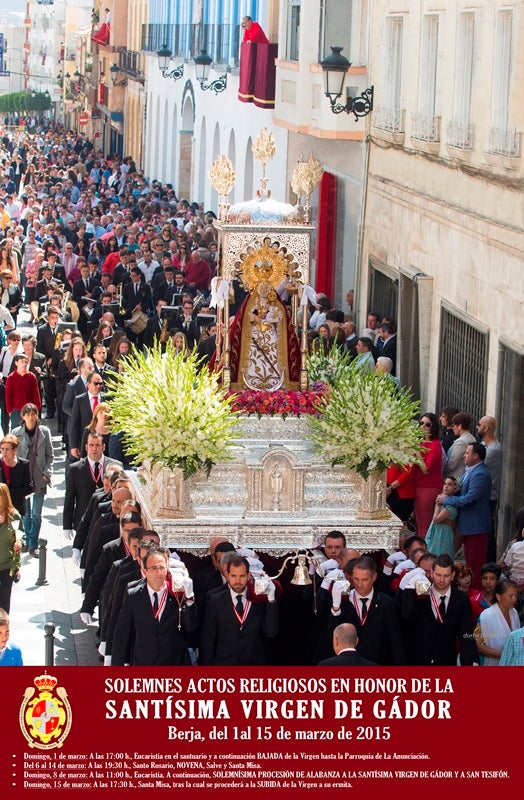 Entre el 1 y el 15 de marzo, Berja celebra los actos religiosos en honor a la Virgen de Gádor. La programación comienza el primer ... día de marzo, a las cinco de la tarde, con la celebración de una misa en la Ermita y la tradicional bajada de la imagen a la parroquia virgitana donde permanecerá durante el culto.