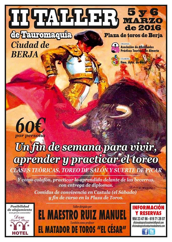 El Taller de Tauromaquia se desarrollará en jornada intensiva desde la mañana del 5 de marzo hasta la tarde del día 6, y las inscripciones, ... con un precio de 60 euros sin alojamiento, se pueden realizar en la página web de la Asociación de Aficionados Prácticos Taurinos de Almería o contando a través de teléfono o correo electrónico con esta entidad.