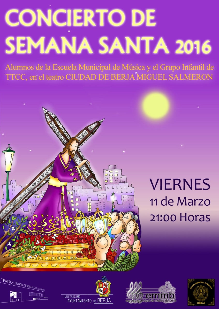 Medio centenar de músicos de la Escuela Municipal de Música de Berja y del grupo de Tambores y Cornetas creado este año, ofrecerán hoy un concierto de Semana Santa en el Teatro Ciudad de Berja "Miguel Salmerón" a partir de las 21:00 horas.