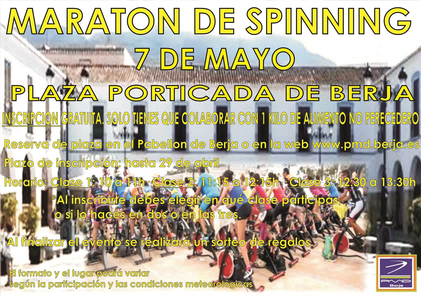 La Plaza Porticada de Berja se convertirá en un improvisado gimnasio para ayudar a quienes más lo necesitan. La concejalía de Deportes del Consistorio virgitano ... y el Patronato Municipal de Deportes de Berja han organizado el primer maratón de spinning al aire libre, previsto para el 7 de mayo. Dividido en tres clases, las sesiones comenzarán a las diez de la mañana y terminarán a la una y media del mediodía. Los participantes podrán inscribirse en los turnos que deseen y al finalizar optarán al sorteo de varios regalos. «El maratón tiene como finalidad llevar el spinning a la calle y que todo aquel que participe conozca los beneficios de practicar deporte al aire libre», han informado desde el Ayuntamiento. El plazo de inscripción se encuentra abierto a través de www.pmd.berja.es o de forma presencial en el Pabellón de Deportes de Berja. «Para la inscripción, que es gratuita, solo se pide a cambio un kilo de alimentos no perecederos que serán entregados a Cáritas Parroquial de Berja», añaden las mismas fuentes. El plazo de inscripción finaliza el próximo 29 de abril.