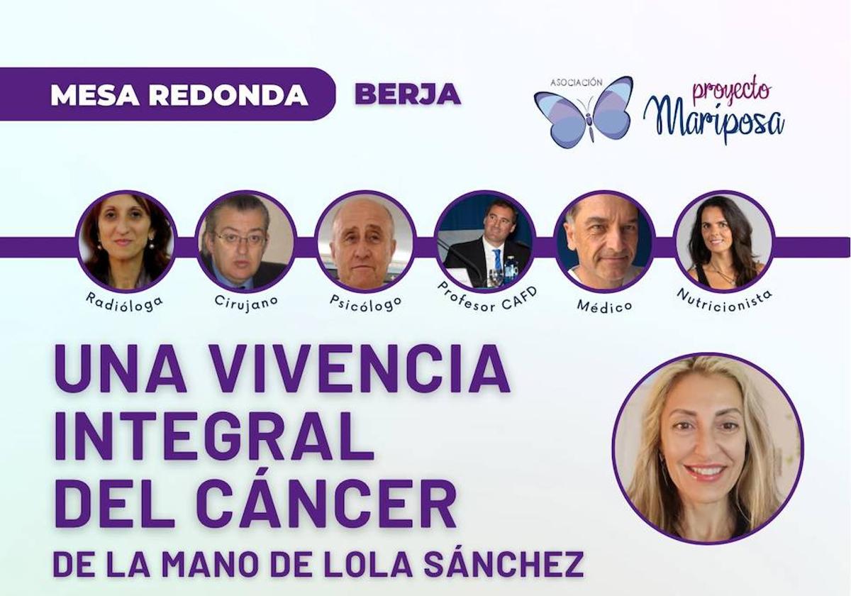 La mesa redonda está organizada por la Asociación Proyecto Mariposa con la colaboración del Ayuntamiento de Berja y contará con Lola Sánchez como protagonista y su historia en el abordaje integral de su cáncer, acompañada por grandes profesionales de la salud, que expondrán sus conocimientos así como su modo de trabajo en casos como este.