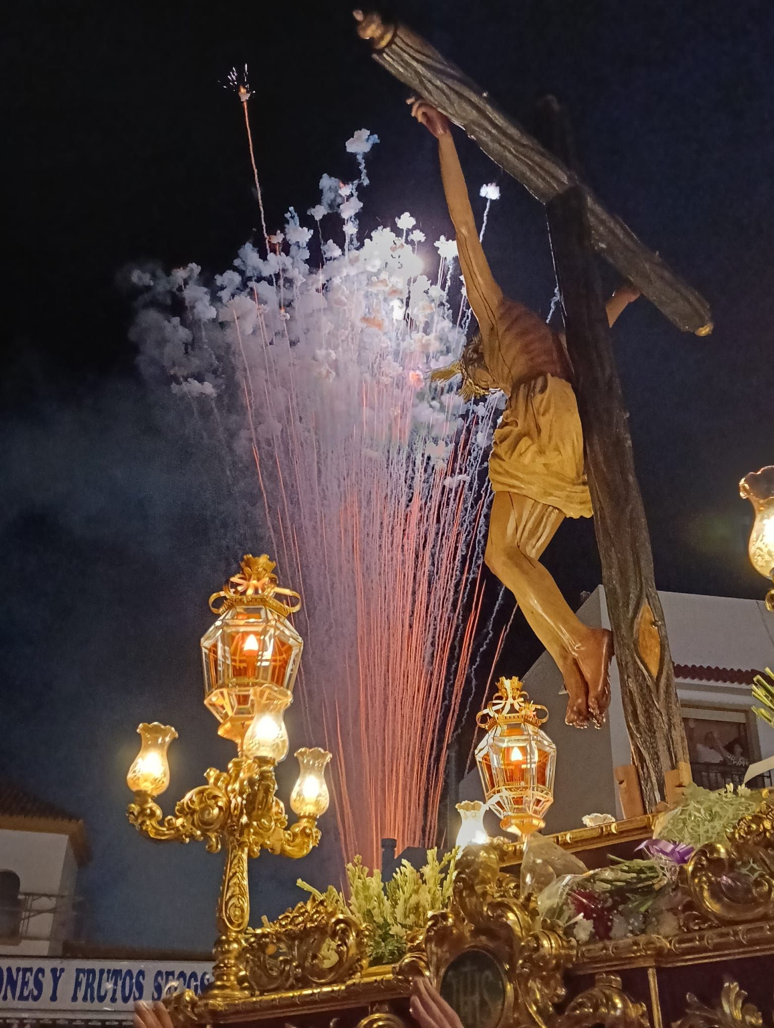 El santísimo Cristo, entronizado en un paso adornado con esmero, emergió de su santuario entre aplausos, vítores, lágrimas y el silencio expectante de quienes aguardaban desde hacía horas, bañados en el aroma de incienso mezclado con el de la pólvora.