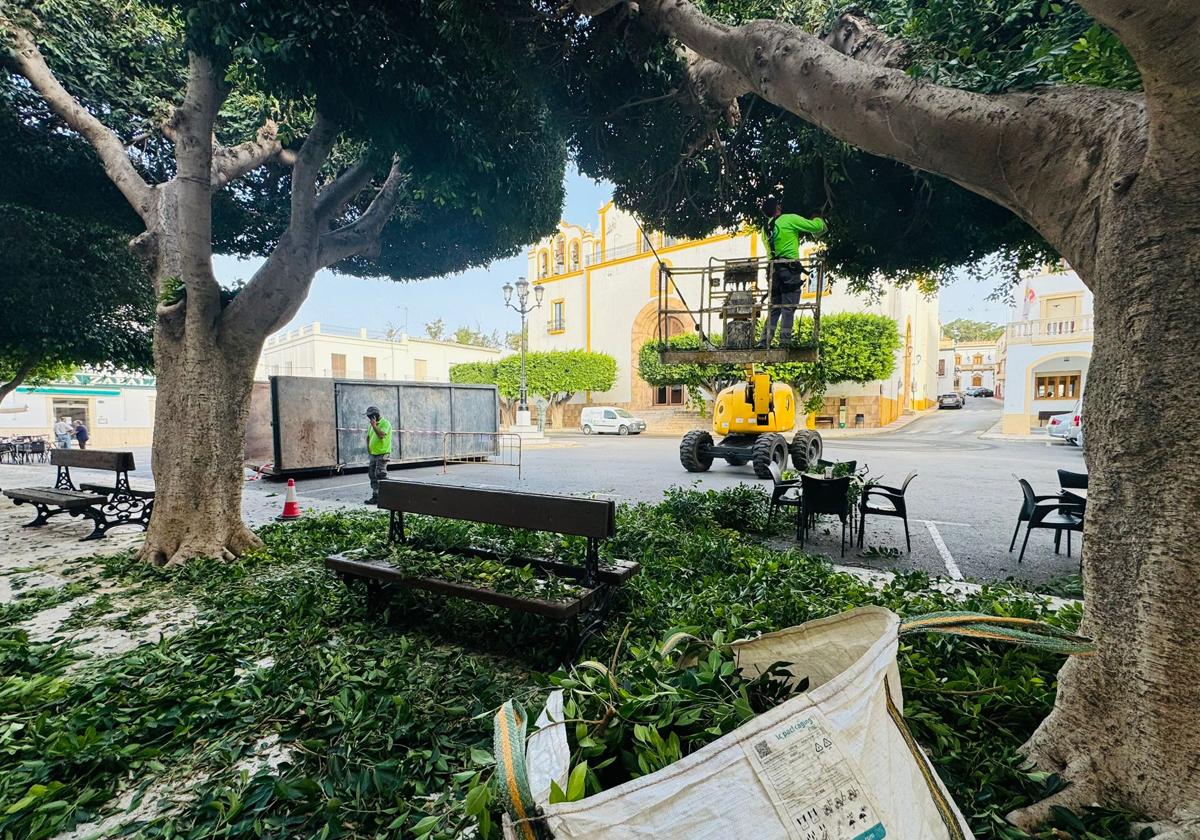 El Ayuntamiento inicia las labores de poda y mejora en la Plaza del Cristo de la Luz como parte del plan de embellecimiento previo a las fiestas en honor al Santísimo Cristo de la Luz