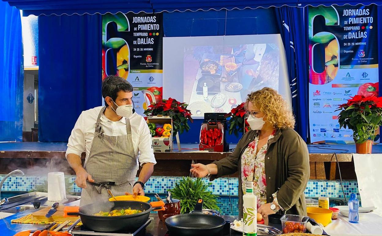 Enrique Sánchez pudo comprobarlo en primera persona. El chef y también presentador de Canal Sur Televisión sorprendió a los presentes con la elaboración en directo de unas tortillitas de pimientos y gambas y unas migas en piperrada. Dos días antes, la conocida cocinera daliense Ana Ruiz también impresionó al público asistente con varias sugerencias gastronómicas: ajoblanco con helado de pimiento, espuma de patata con caponata y aceite de cilantro y bombón de pimiento relleno de crema de nueces.