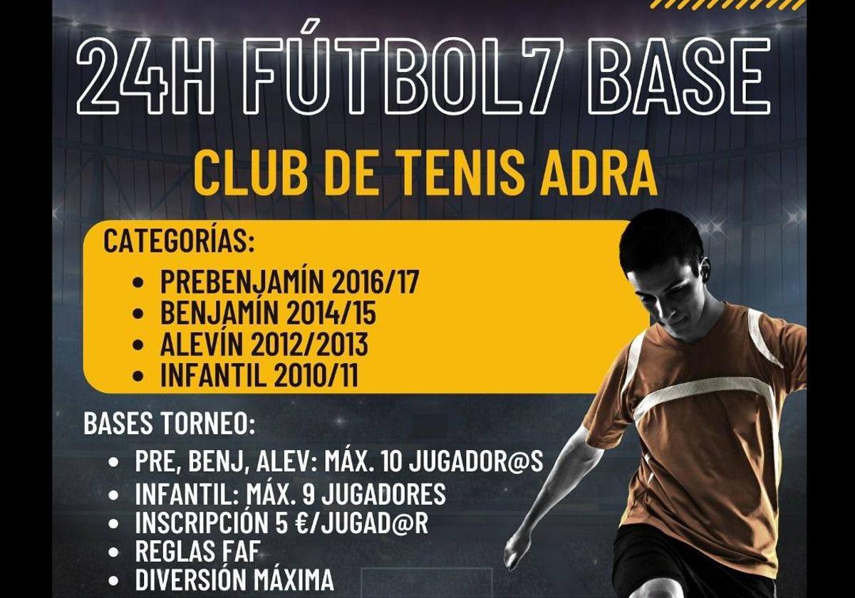 Las instalaciones el Club de Tenis de Adra acogerán un torneo mixto de fútbol 7. Se desarrollará entre el 28 y el 29 de diciembre. ... Se contempla la participación de jugadores de las categorías prebenjamín, benjamín, alevín e infantil. Pueden jugar socios y no socios, ya sean vecinos de Adra o de los municipios cercanos.