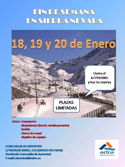 La Concejalía de Juventud del Ayuntamiento de Adra ha organizado para los días 18, 19 y 20 de enero un fin de semana en Sierra Nevada para disfrutar del esquí.