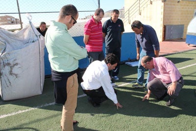 El alcalde de Adra, Enrique Hernando, acompañado por el concejal de Deportes, Juan Antonio González; el concejal responsable del Área, Moisés Linares, así como miembros de la directiva del Club Deportivo Adra Milenaria como su presidente Ramón Figueredo y técnicos municipales del Área de Deportes, visitaron hace unos días las obras de mejora y reforma del césped artificial del Estadio de Miramar en compañía de técnicos de la empresa encargada de realizar los trabajos, 'Fieldturf Poligras' y han comprobado la evolución y el cambio sustancial que sufrirá el campo de fútbol una vez que sea cambiado el caucho cristalizado por otro nuevo y se produzca el cepillado de la hierba del campo.