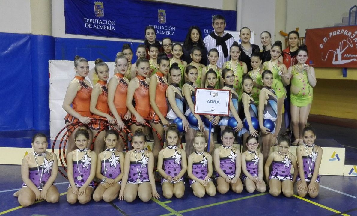 Las alumnas de la Escuela Deportiva Municipal de Gimnasia Rítmica han conseguido tres medallas en la primera prueba del Circuito de Promoción de Gimnasia Rítmica ... organizado por la Diputación de Almería con la colaboración del Ayuntamiento de Adra. Esta prueba ha congregado a casi 500 participantes de toda la provincia en el Pabellón Municipal de Deportes de Adra, entre ellas 50 abderitanas del Club Deportivo Purpurina.